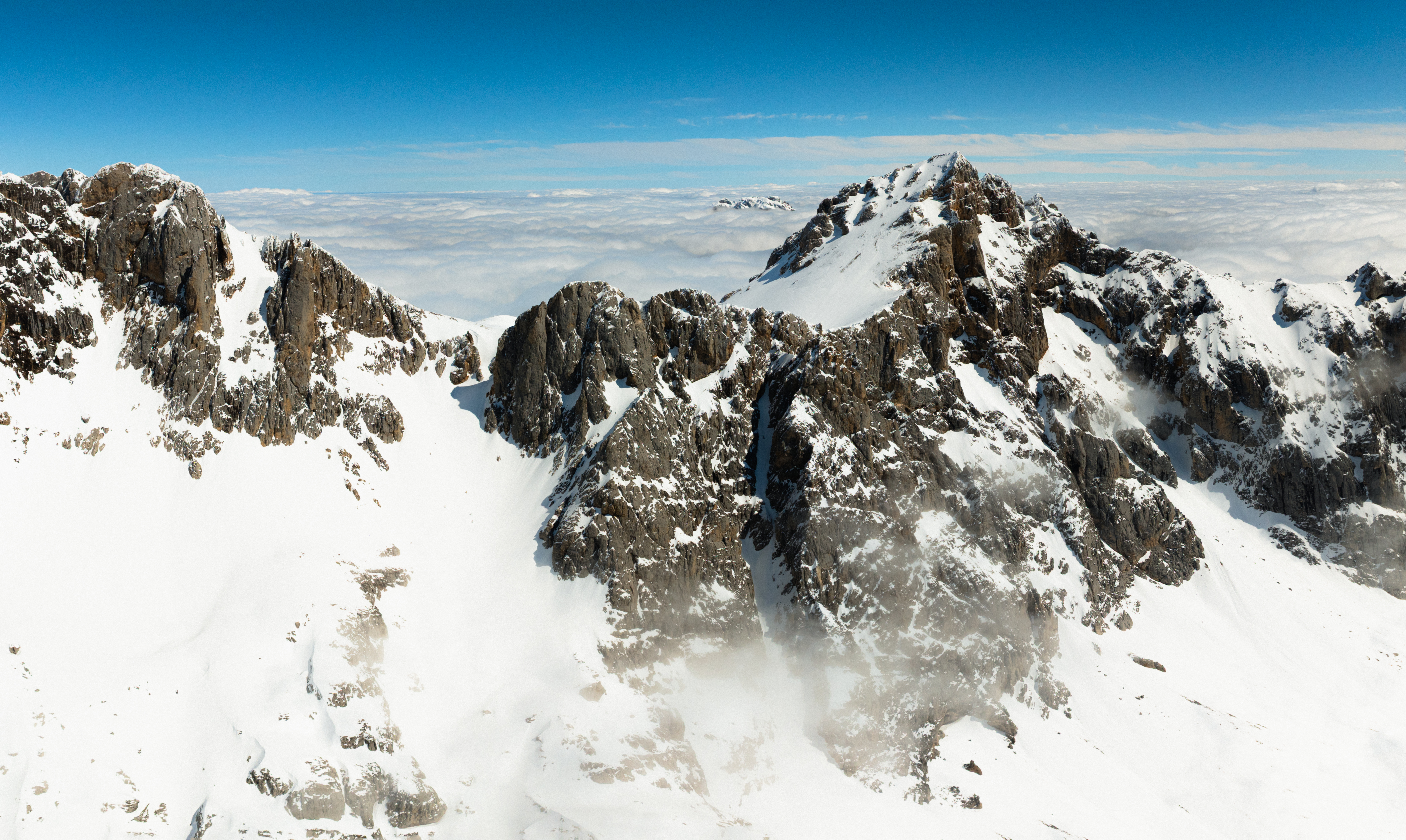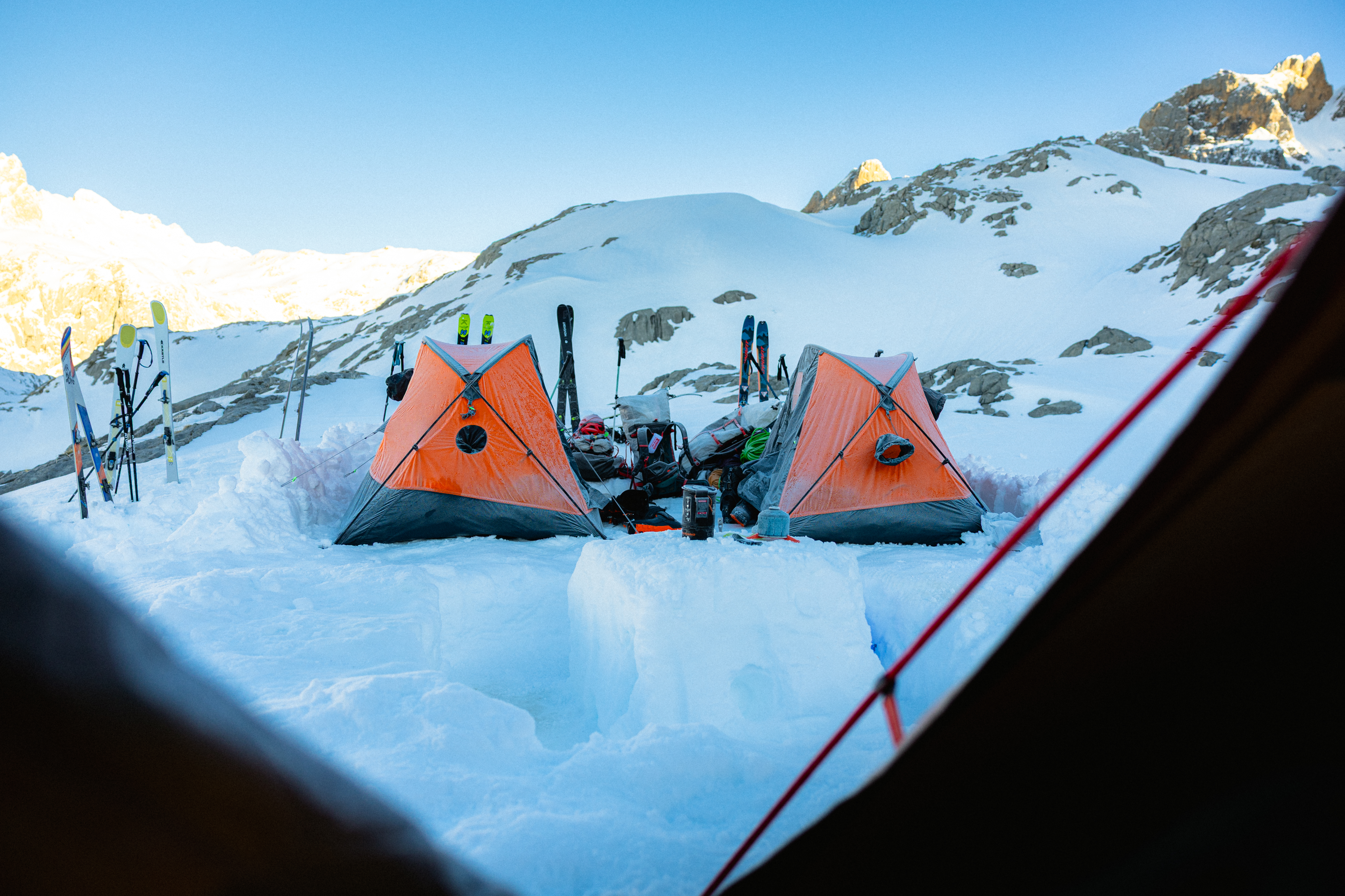 From this temporary camp, set inside a jou — the characteristic karst depressions that shape the geography of the Picos de Europa — the team explores couloirs, slopes and frozen summits over several days, moving through a landscape where winter dictates its own rules.