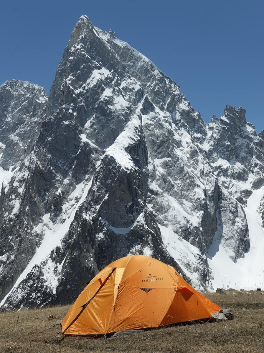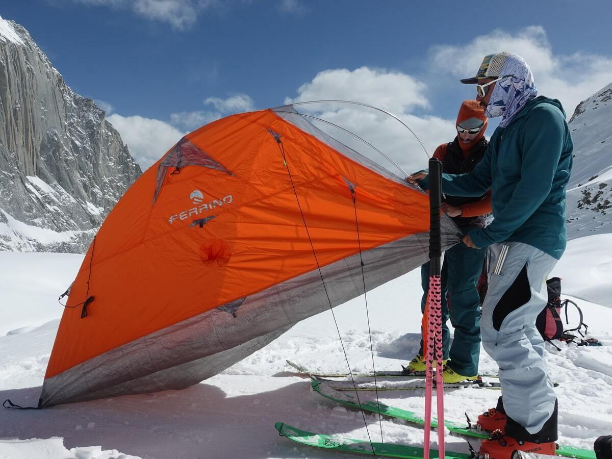 Molto bene direi! Con noi avevamo due tende. Una era la Piler 3, che mi accompagna già da un po’ di anni e che abbiamo montato al campo base. Per me è stata l’ennesima conferma del fatto che si tratta di una tenda super valida per questo tipo di utilizzo, anche su neve e anche a temperature piuttosto basse. L’altra tendina era la nuova Blizzard 2. L’abbiamo usata un solo giorno sulla seconda montagna, testandola al limite delle sue capacità e forse anche un po’ oltre. Infatti eravamo in tre in una tenda da due... a meno 38 gradi! Un test estremo, ma superato in modo egregio! Poi avevo con me il sacco a pelo Lightec 1200, che non è un prodotto pensato per le temperature più rigide. Nonostante ciò, ha fatto molto bene il suo lavoro e al campo base mi ha consentito di fare delle belle dormite! Nota di merito anche per lo zaino Instinct 30+5... forse un po’ piccolo in certe fasi di trasporto dei materiali sulla montagna, ma questa è colpa mia: Ferrino ne produce anche uno con litraggio superiore, ma a me gli zaini grandi stanno troppo antipatici! È sicuramente un’attrezzatura da trattare con un po’ di attenzione quando si maneggia con le lamine degli sci, ma in fase di salita è perfetto ed è davvero, davvero comodo anche in discesa!